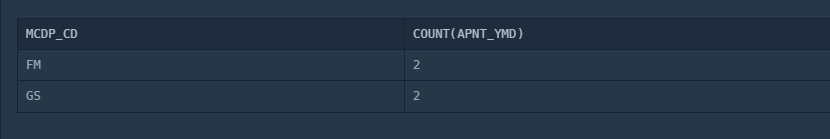 SELECT MCDP_CD, COUNT(APNT_YMD)