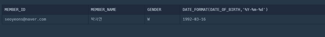 SELECT MEMBER_ID, MEMBER_NAME, GENDER, DATE_FORMAT(DATE_OF_BIRTH,'%Y-%m-%d')