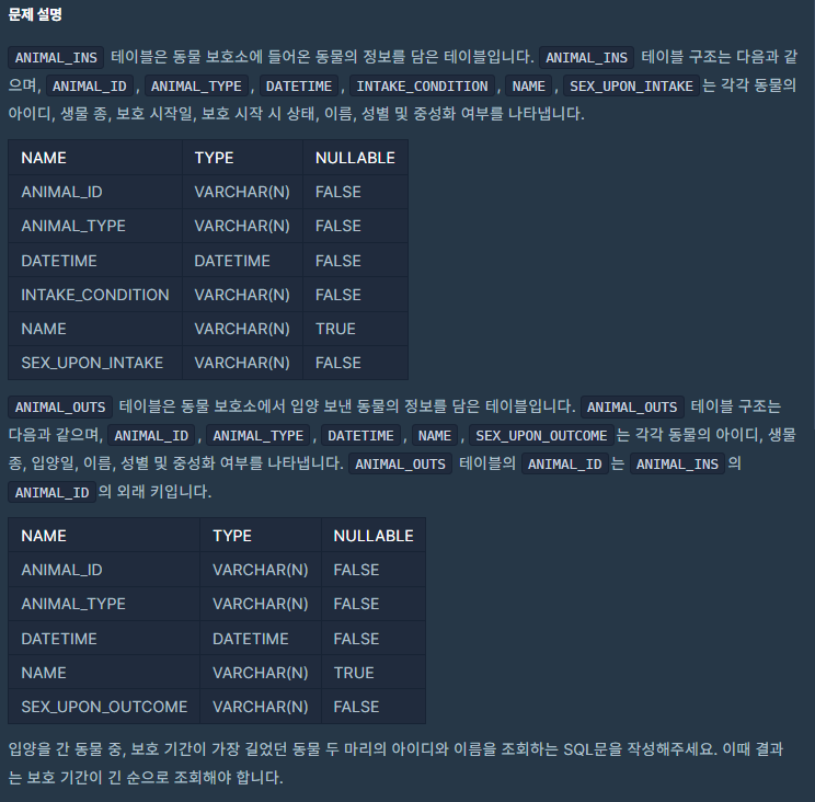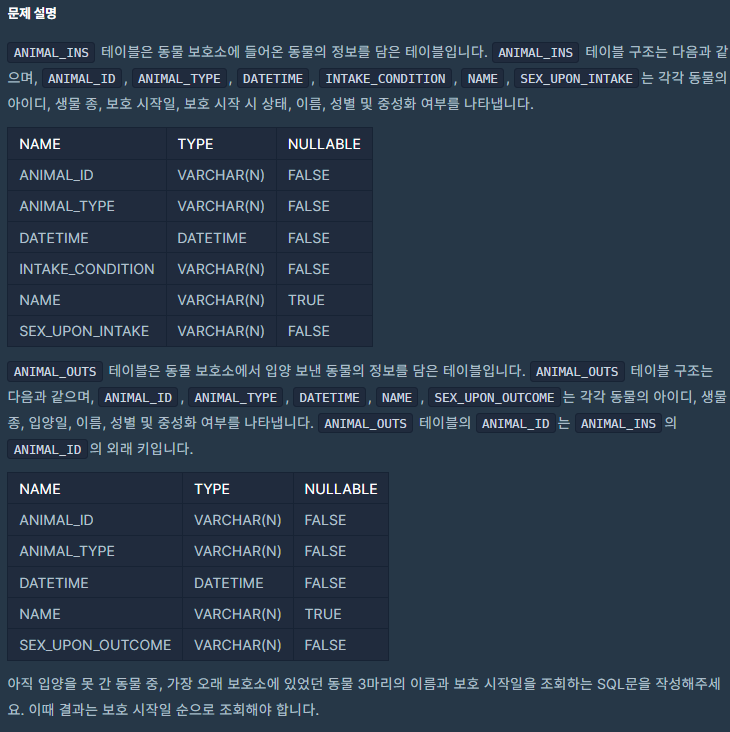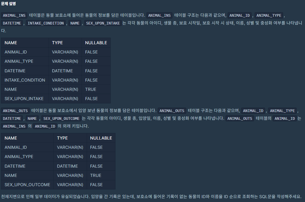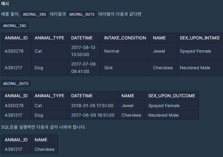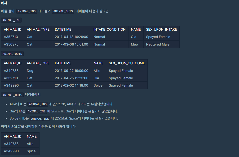 FROM ANIMAL_INS I LEFT OUTER JOIN ANIMAL_OUTS O