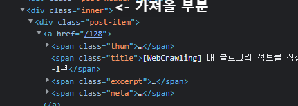 class가 inner인 div의 정보를 가져올 것이기에 위와 같이 작성하였다