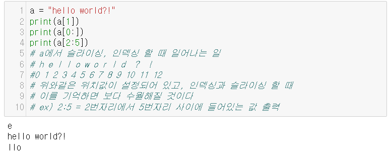 - 인덱싱은 변수명[위치], 슬라이싱은 변수명[시작위치:(끝위치+1)] 형태로 사용한다