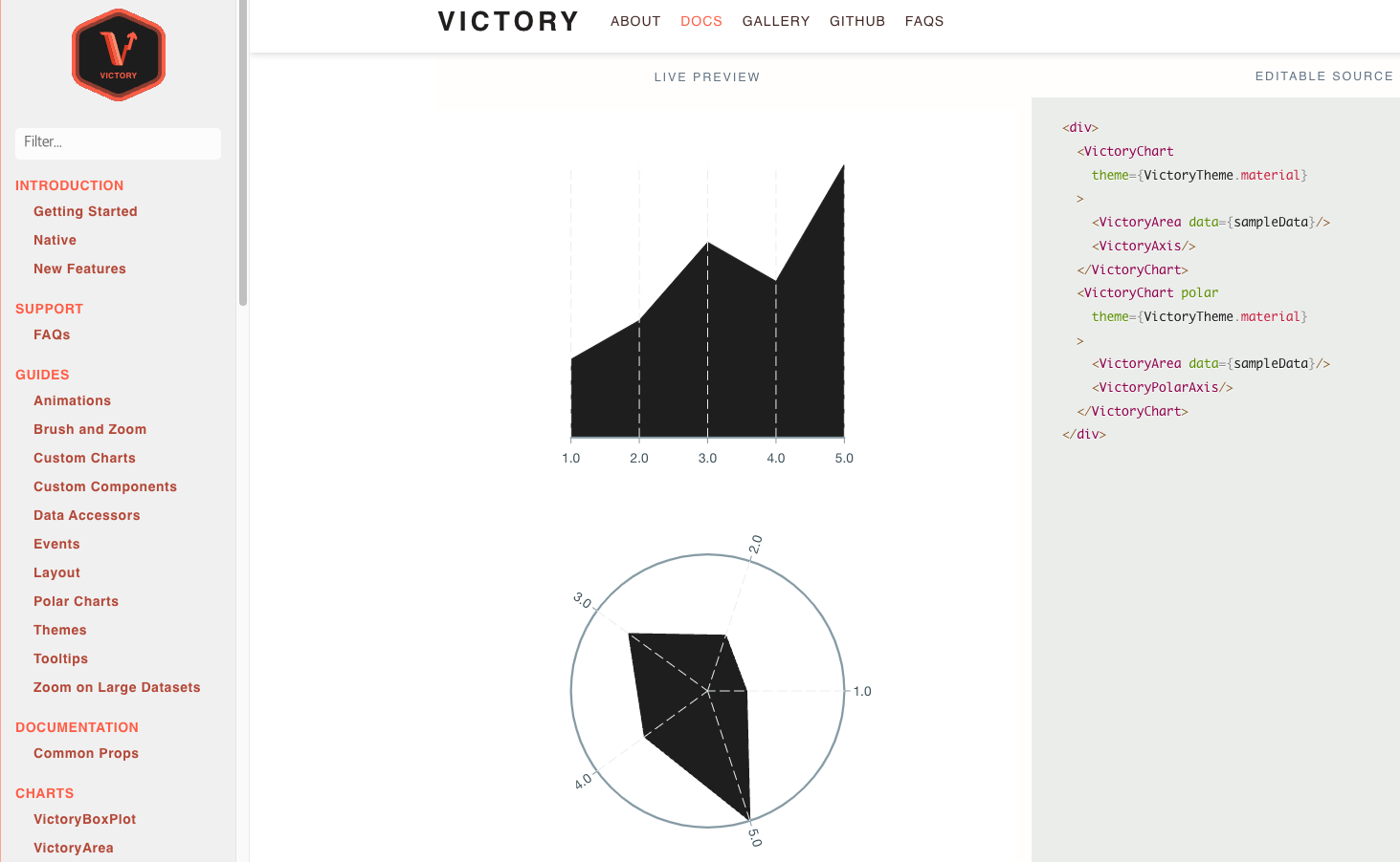 Victory는 React와 React Native를 위한 선언적인 차트 라이브러리입니다. 데이터 시각화를 위한 다양한 컴포넌트를 제공하며, 매우 확장성이 높습니다. 그러나 초기 설정이 복잡할 수 있습니다.
