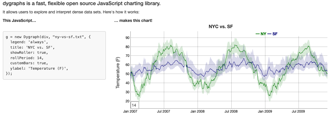 Dygraphs는 큰 데이터셋의 시계열 데이터 시각화에 특화된 자바스크립트 차트 라이브러리입니다. 높은 성능을 유지하면서 데이터를 다루며, 동적인 상호 작용을 제공합니다.