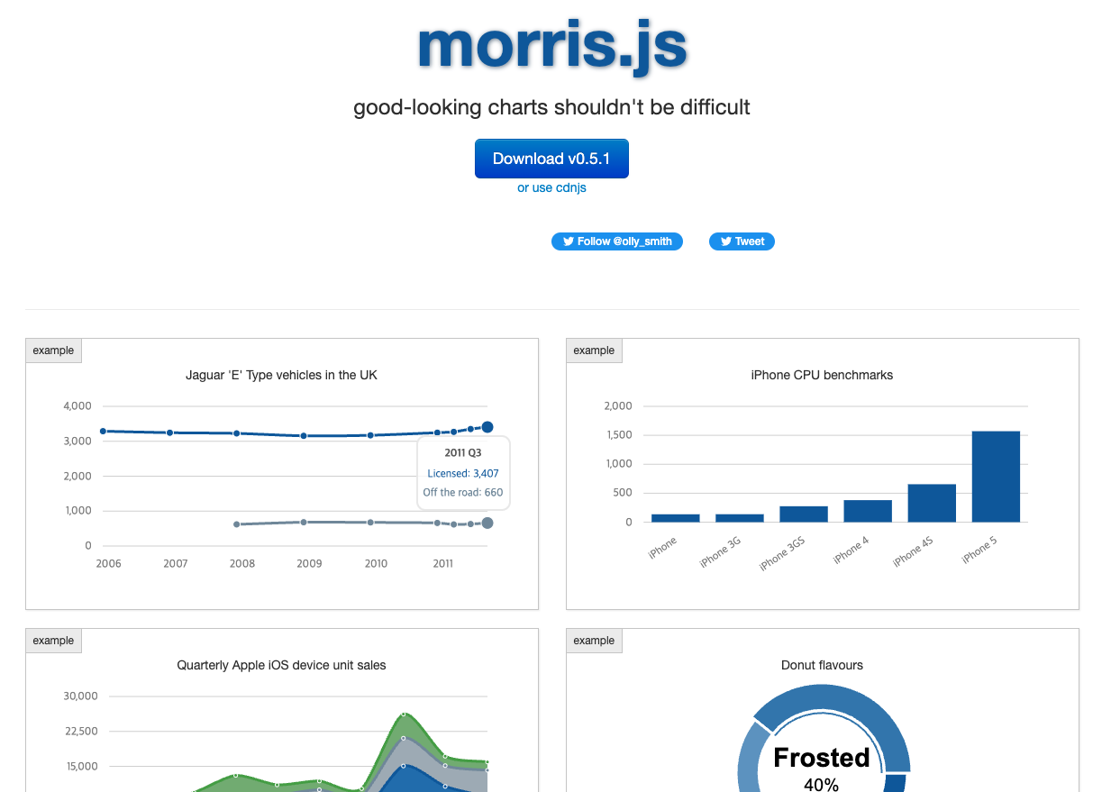 Morris.js는 jQuery 기반의 간단한 차트 라이브러리로, 빠르게 차트를 구현할 수 있습니다. 하지만 차트 유형이 제한적이며, 커스터마이징 옵션이 적습니다.