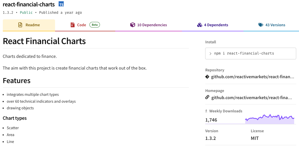 React-financial-charts는 주식 및 금융 시장 데이터에 특화된 React 차트 라이브러리입니다. 다양한 금융 차트 유형을 지원하며, 사용자 정의 기능이 풍부합니다.