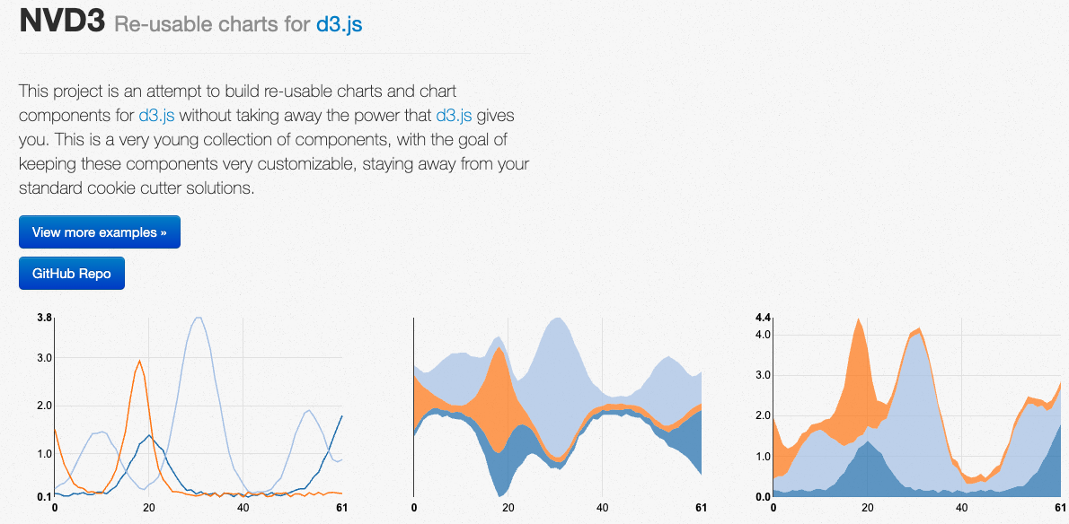 NVD3는 D3.js 기반의 차트 라이브러리로, 다양한 차트 유형과 기능을 제공합니다. D3의 기능을 더욱 사용하기 쉽게 만들어 줍니다.