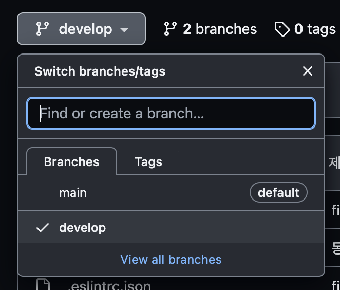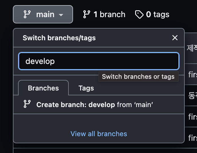 실제로 작업을 할 때 develop 브랜치가 아닌 main 브랜치에 작업을 하고 커밋을 누르자