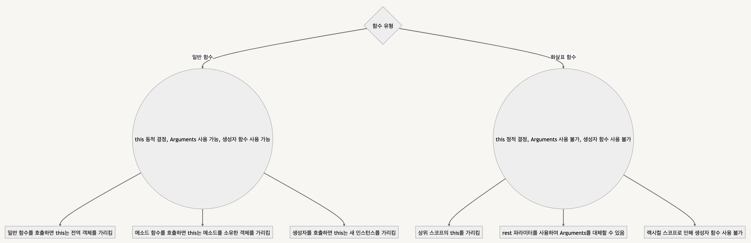 - 화살표 함수에서: 화살표 함수에서는 this가 렉시컬 스코프를 가리키기 때문에 생성자 함수를 사용할 수 없습니다.