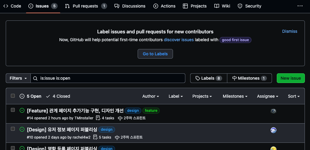 Labels는 이 작업을 나타내는 태그를 선택합니다 (여기서는 디자인 작업을 하였으므로 design을 선택합니다)