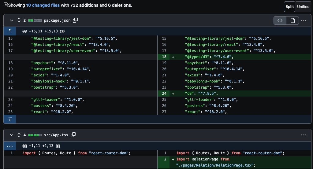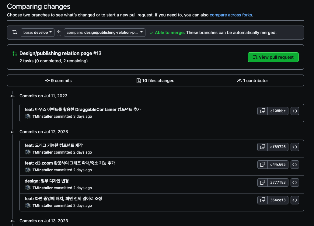 그렇게 브랜치를 누르실 경우 다음 화면과 같이 커밋 내역과 변경사항들이 보여지게 됩니다.