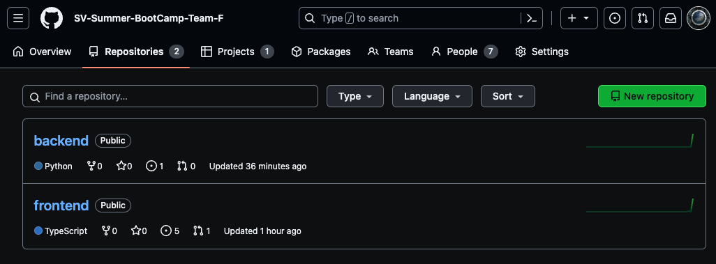 우선 개인 컴퓨터가 준비가 되셨고, 팀 organization이 있다면 그 안에 프로젝트 레포지토리로 들어가줍니다.