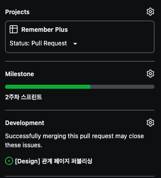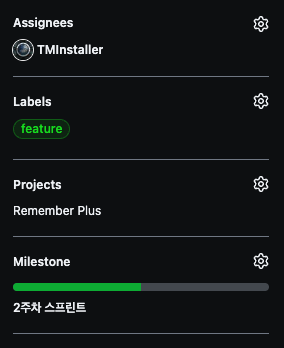 MileStone에는 스프린트 단위로 쪼개놓은, 미리 생성해둔 마일스톤을 선택합니다. (2주차이므로 2주차 프로젝트를 선택합니다)