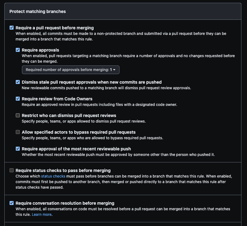 여기서는 1명 이상의 리뷰어가 Approve를 해야하고, 모든 리뷰가 해결되어야만 merge 가능하도록 설정하였습니다.