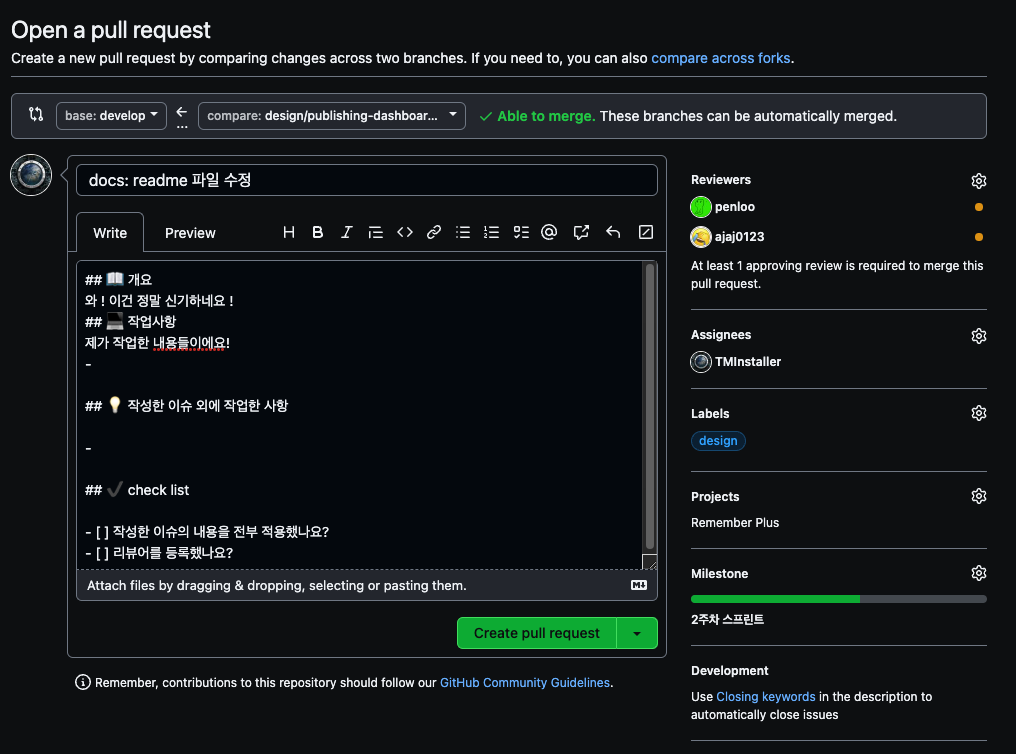 그렇게 미리 제작된 PR 템플릿이 존재한다면 아래와 같이 나타날 것입니다.