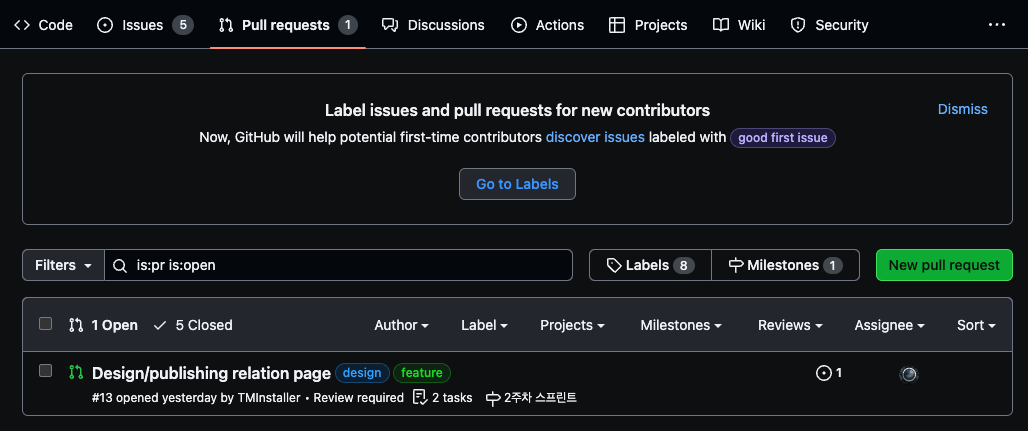 PR의 경우에는 아래의 화면에서 오른쪽 초록색 버튼 New pull request를 눌러 생성해줍니다.