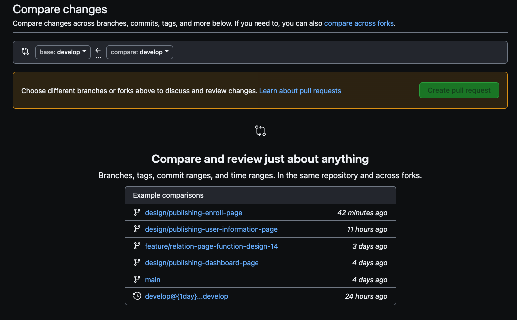 pull request를 누르면 생성되어 있는 브랜치가 하단에 보여집니다.