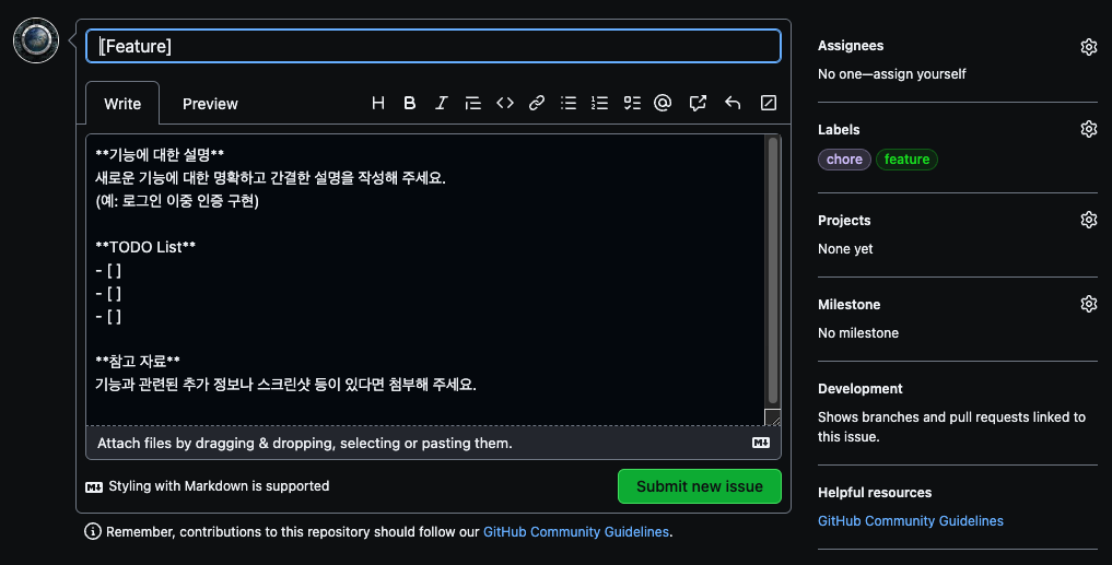 Labels는 이 작업을 나타내는 태그를 선택합니다 (여기서는 기능 구현만을 할 것이므로 feature만 선택합니다)