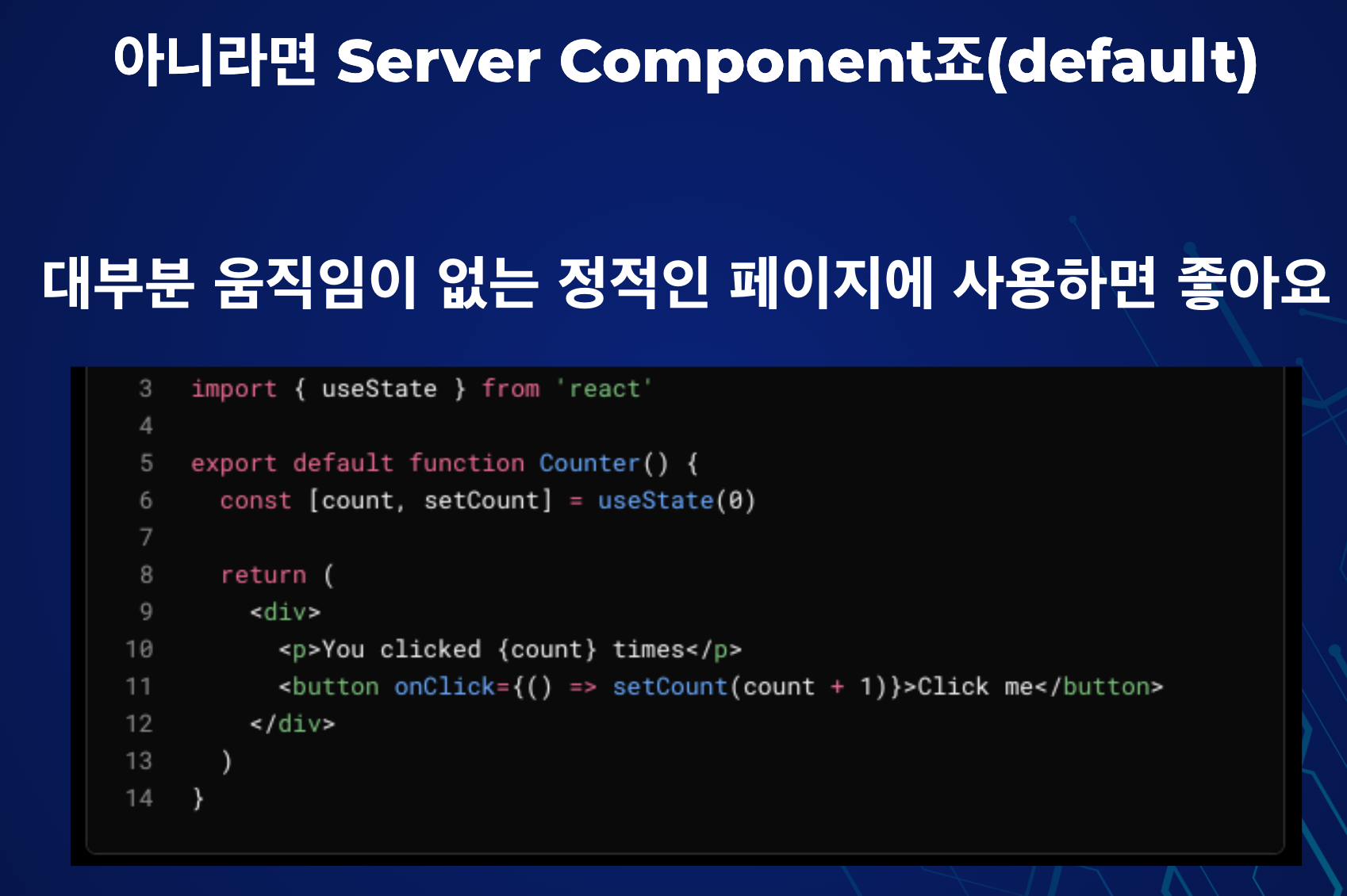 'use server' 이런 코드를 입력해두지 않고, 그냥 컴포넌트를 만들어 두면 서버 사이드 렌더링으로 적용됩니다.