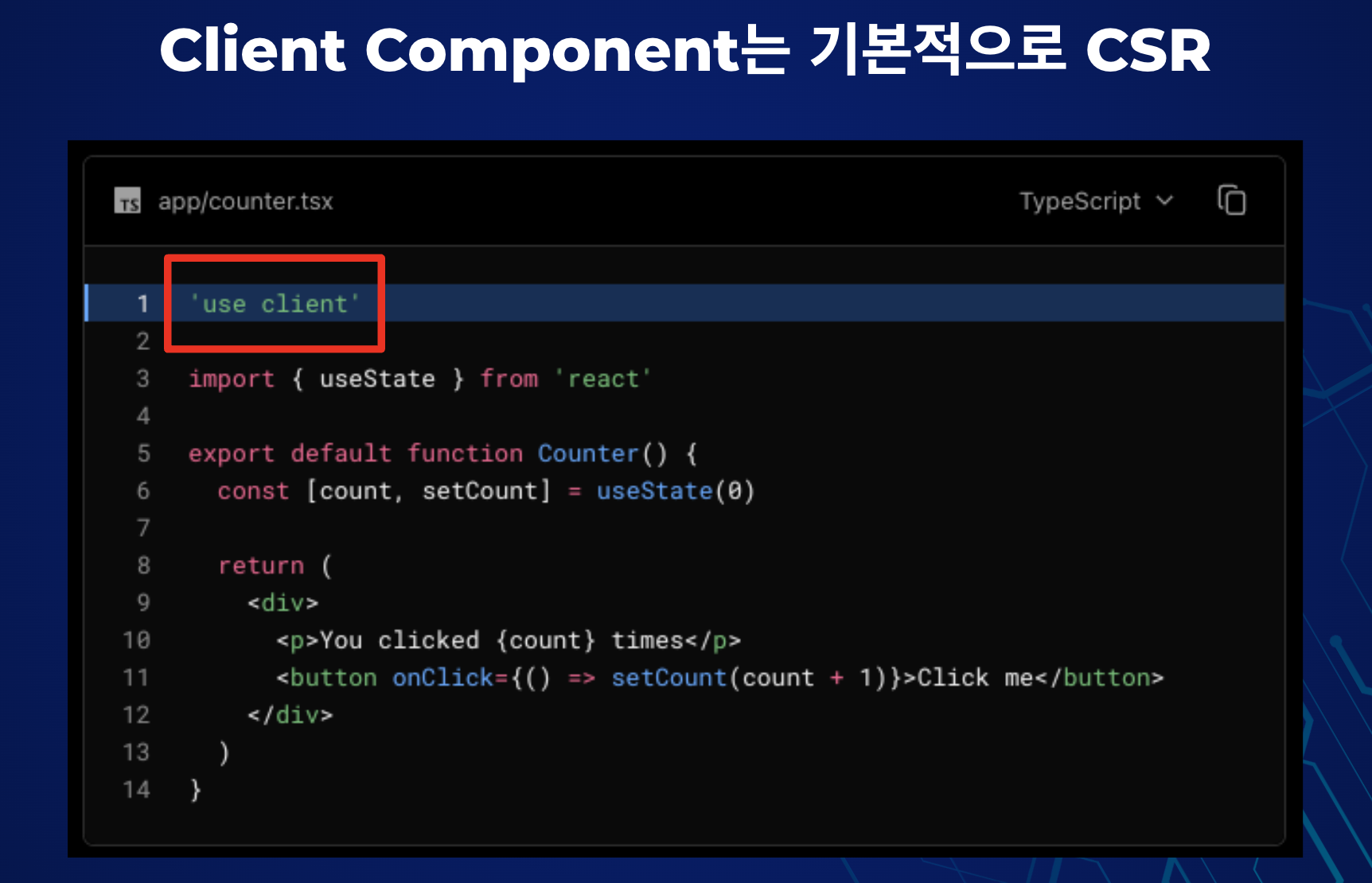 CSR을 적용하기 위한 방법이 정말 간단해졌습니다. 바로 코드파일 위해 'use client'를 입력하기만 하면 되는 것이죠.