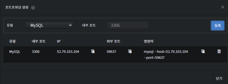 여기서 기억해야 할 것은 IP와 외부 포트이다