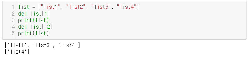 - 슬라이싱을 이용해 범위를 지정하여 제거하는 것이 가능하다