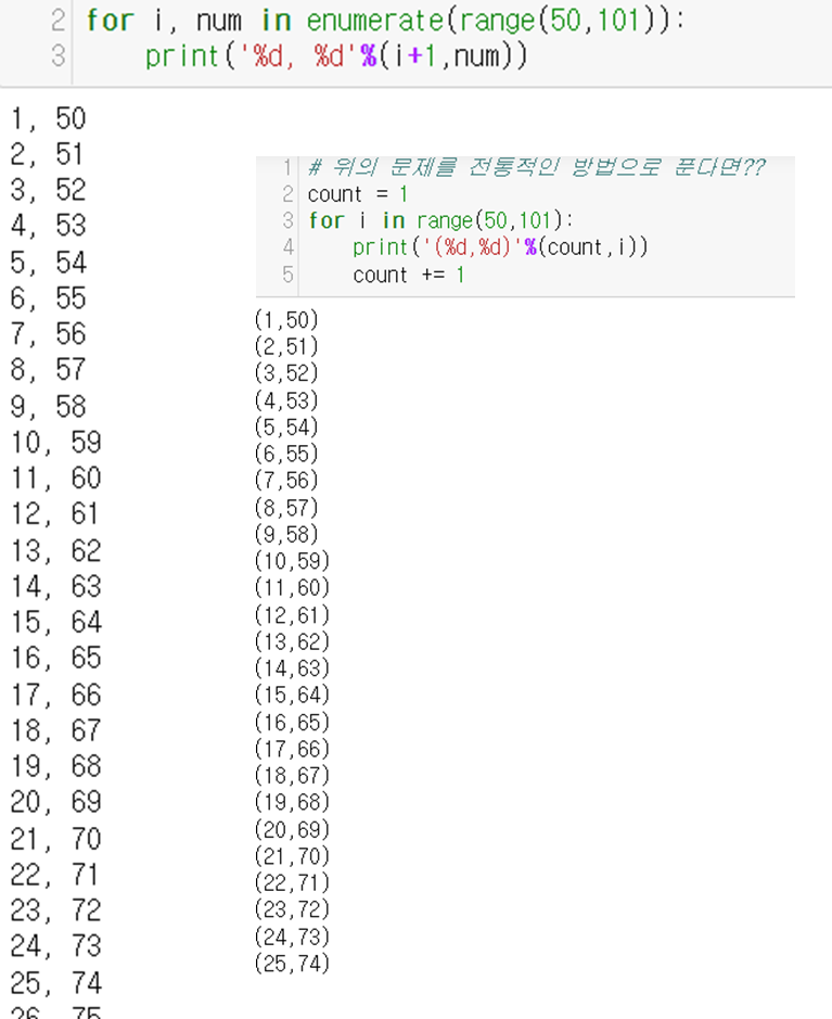 [예제2] enumerate를 사용해서 50~100까지의 수를 오름차순으로 나타내며
