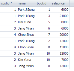 (고객번호, 고객명, 도서번호, 구매금액 출력)