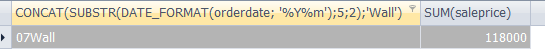 SELECT CONCAT(SUBSTR(DATE_FORMAT(orderdate, '%Y%m'),5,2),'Wall'), SUM(saleprice)