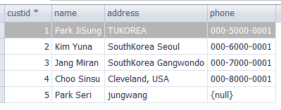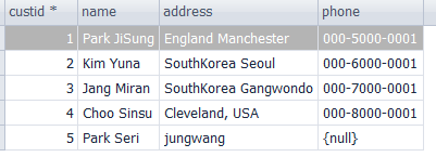 2.UPDATE.1 custid가 5인 소비자의 주소를 "jungwang"으로 바꾸기