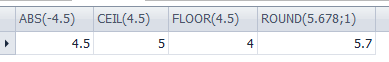 SELECT ABS(-4.5), CEIL(4.5), FLOOR(4.5), ROUND(5.678,1)