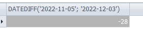 SELECT DATEDIFF('2022-11-05', '2022-12-03')