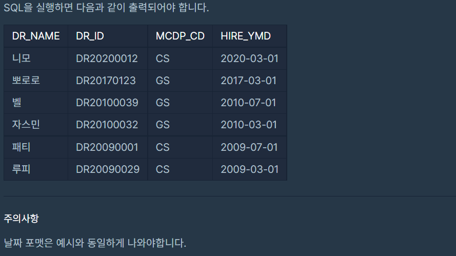 SELECT DR_NAME, DR_ID, MCDP_CD, DATE_FORMAT(HIRE_YMD, "%Y-%m-%d")